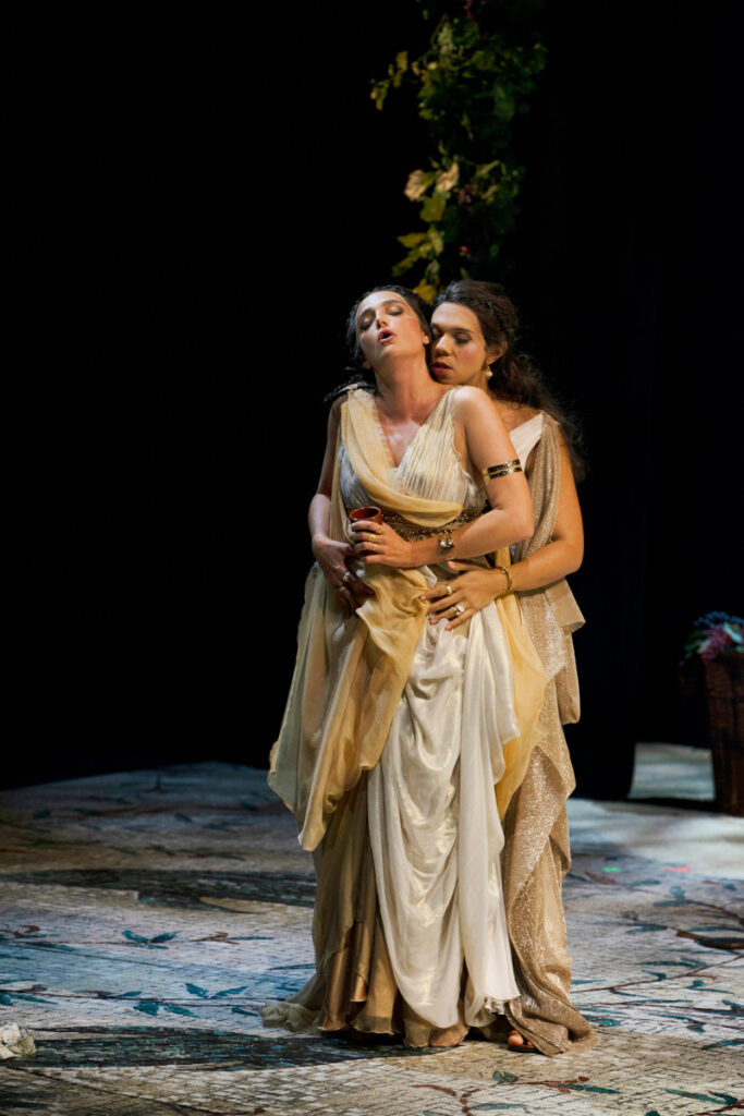 Countertenor Nicolò Balducci is smoother voiced and liquid in sonority, aptly characterising Odysseus’s wiliness with an entrancing lustre as he seeks to uncover Pyrrha’s true identity. Dubiously testing ‘her’ physicality with something of a sexual embrace brings homoerotic tensions to the fore, just as the interactions between Deidamia and Achilles in female form. Rory Musgrave is vocally more forthcoming as Phoenix, another member of the embassy for Achilles, direct in his addresses to the latter as also to Deidamia’s confidante, Nerea, to whom he takes a liking. Sarah Gilford brings charm and warmth to that role, as also does Petros Magoulas in the part of Lycomede, almost purring in the downward slides of the mellow aria where he reflects on age.