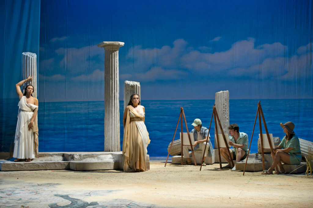 Cross-dressing and avoiding the call up to war already subvert the themes of heroic masculinity and the glorification of warfare, which are central to Homeric epic (tellingly, the sources for the story come from a much later period in Classical literature). Petrou takes the satire a step further by setting the action against the backdrop of Skyros in the present day as a holiday resort where tourists are invited to enact their own myths. A group of silent extras visit the island for a wedding, and play out their fantasies and desire for diversions around the ancient drama that unfolds.