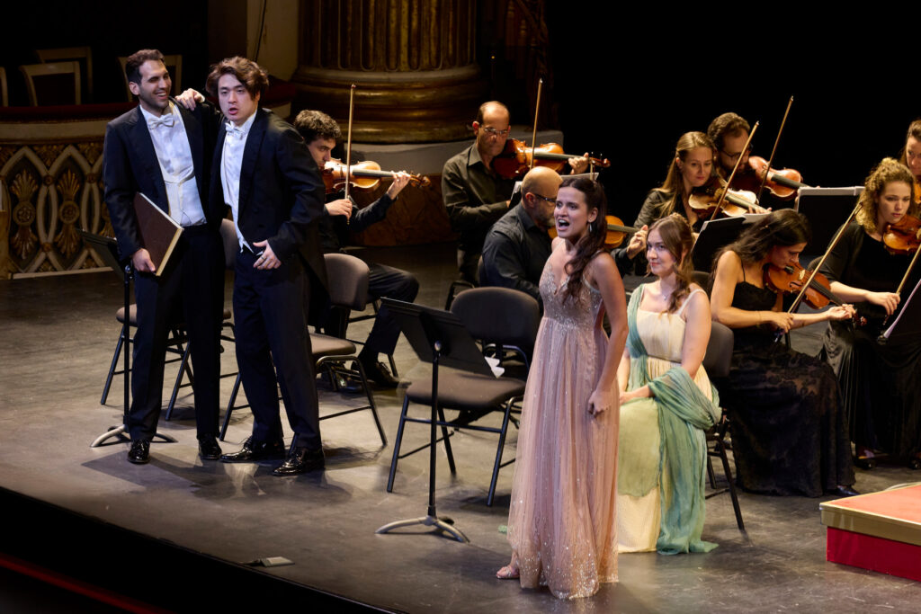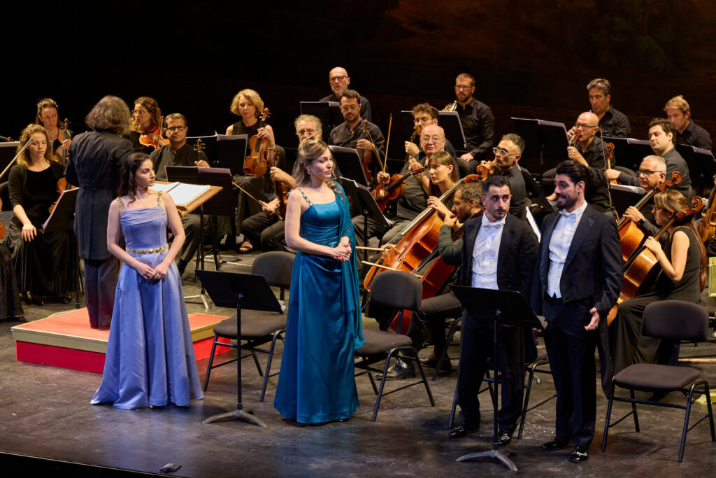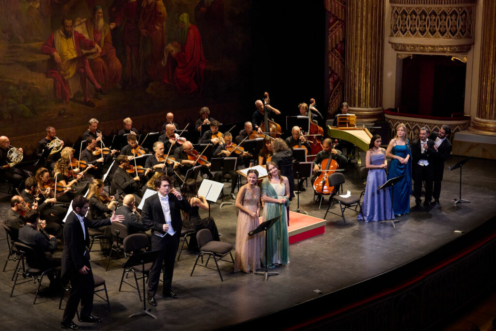 Although given in a semi-staged performance here, the members of the Teatro di San Carlo’s Academy for young singers still generated much dramatic tension and comedy in rendering the delusional Don Quixote and his faithful sidekick, Sancio Panza’s encounter with the aristocratic ladies and the two inept men who seek to woo them, Platone and Galafrone. With the singers lined up at the front of the stage, the acted-out confrontations among the characters created a witty drama of its own, and the antics between the two sets of would-be lovers formed an ironic counterpoint to the Don’s own imagined romance with the non-existent Dulcinea. In the title role, Tianxuefei Sun gave a lyrically sustained account that captured a certain mock heroism, but was too stiffly monochrome to embody the feverish, volatile personality of the character, which gave us the word quixotic in the first place. Sebastià Serra offered more frenetic and exasperated energy as the put-upon but ultimately reliable Sancio.