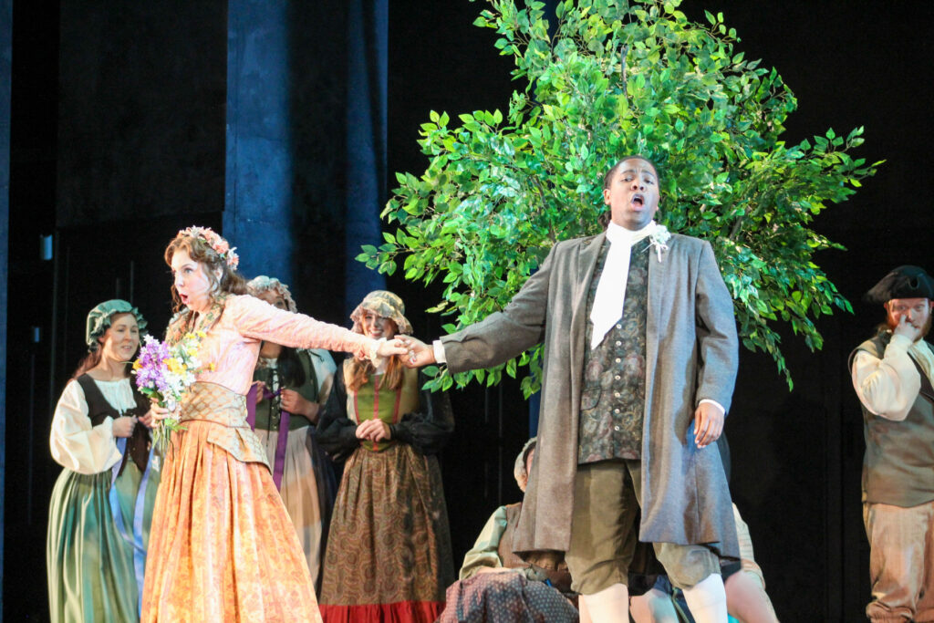 Following that iconic aria was the entrance of Zerlina, played by Sara LeMesh, and Masetto, played by Brandon Bell. This featured an amazing reveal of the wedding set, whose centerpiece was a lovely big tree, adding the perfect amount of color to the otherwise mostly gray-blue stone set design by Steven C. Kemp.