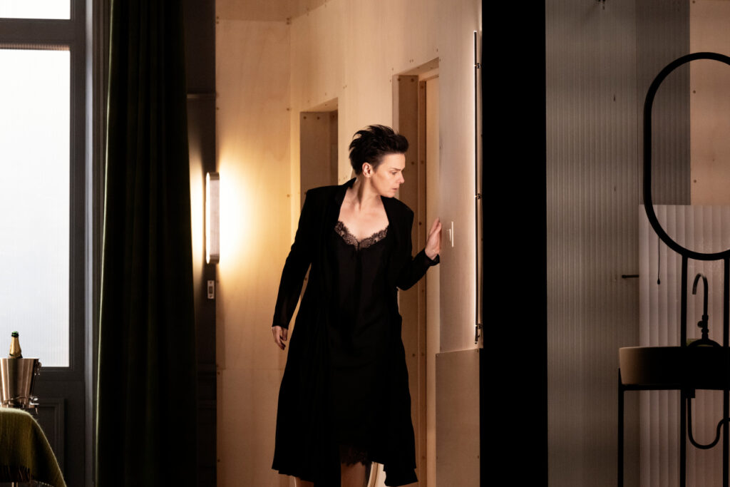 Vicki Mortimer’s set uses recycled materials, in accordance with Mitchell’s aspiration for more sustainable theatre and stagecraft. Although set in nearly the present day, there is a sense of a slightly faded quality and outdated fashion that aptly mirrors the preternaturally aged Emilia, upon whom the effects of the elixir are starting to wear off. The simple lines and geometric shapes of much of the hotel décor, where the action is largely placed, contrast ironically with the almost baroque complexity of the plot.