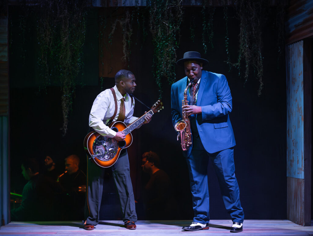 Introduced as the centerpiece of INseries’ 2025-2026 season, The Delta King’s Blues tells a legend of Robert Johnson, considered to be the father of the blues. INseries Executive Director David Mack introduced musician Memphis Gold to start the show, and immediately I loved the vibe from this opening act. Dressed in a beautiful sequined jacket, Gold explained that his mother is from the same town in Mississippi that Johnson’s mother was from, giving a certain gravitas to this production. Gold chose to perform some of Johnson’s music, namely, “Me And The Devil,” and immediately I was transported to the sound-world of the opera. To close one’s eyes and listen to a steel-stringed guitar with a blues singer is to visualize at the same time the Spanish moss and metal washboard paneling of buildings you might find in the rural American South, both of which featured in the fantastic set design by Joshua Sticklin.