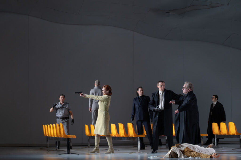 Jakob Peters-Messer’s programme note indicates that he was inspired to stage the work by Christof Loy’s production for Deutsche Oper in 2018, and something of that director’s style seems to rub off on this interpretation. Despite the background of mysticism and metaphysics, the opera plays out like many of Loy’s interpretations, as a this-worldly, domestic bourgeois drama in a sullen, grey space, like a prison, which remains for all three Acts, without much sense of even a physical world beyond, never mind a spiritual or at least moral one. We see, as it were, the ‘banality of evil’. The added silent extra of the Angel is a decidedly embodied entity, not otherworldly, choreographed and danced by Nicole van den Berg, as though the Stranger’s alter ego – or possibly that of the Stranger-and-Heliane (Tristan-esque shades of the discussion of the word und) – expressing its desire for freedom from its present constrained circumstances.